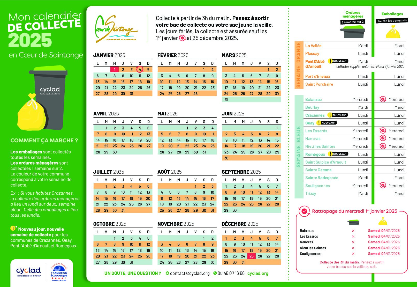 Au 1er janvier 2026, le ramassage des ordures ménagères et du tri sélectif (emballages) aura lieu le mercredi matin. Les emballages (sacs jaunes) seront collectés toutes les semaines. Les ordures ménagères seront collectées 1 semaine sur 2.