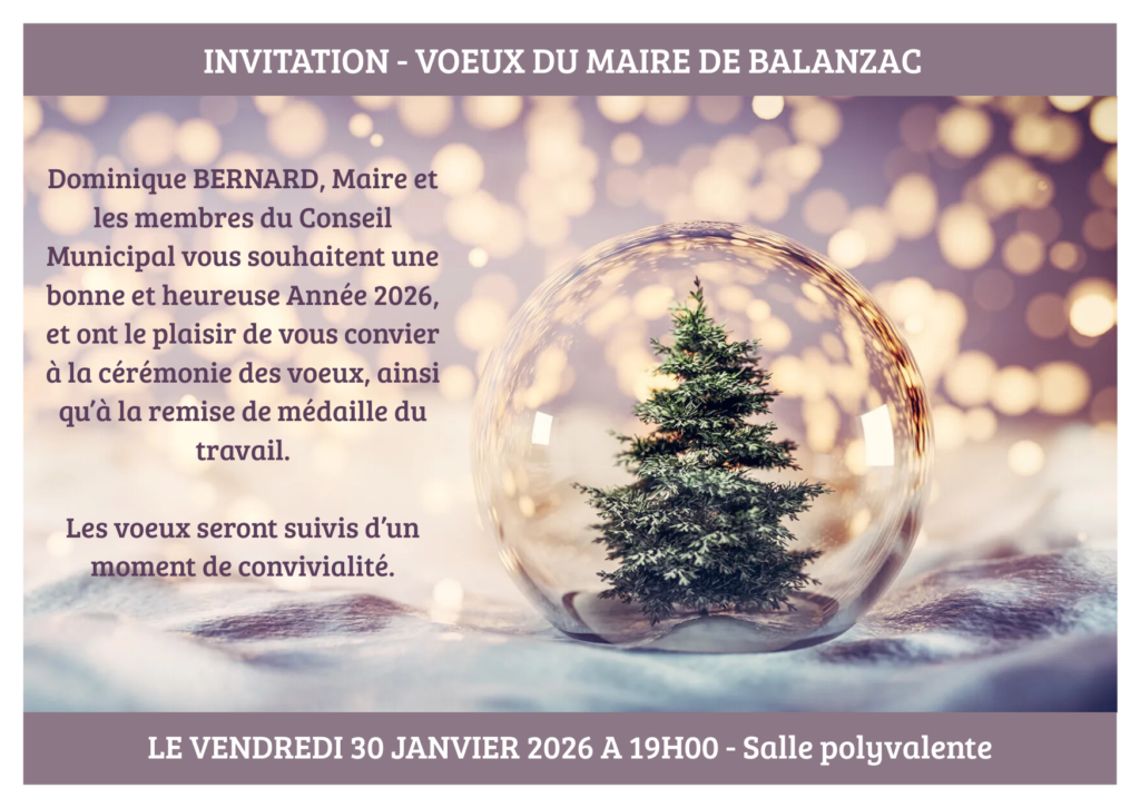Les Vœux du Maire auront lieu le Vendredi 30 janvier 2026 à 19h00 à la salle polyvalente